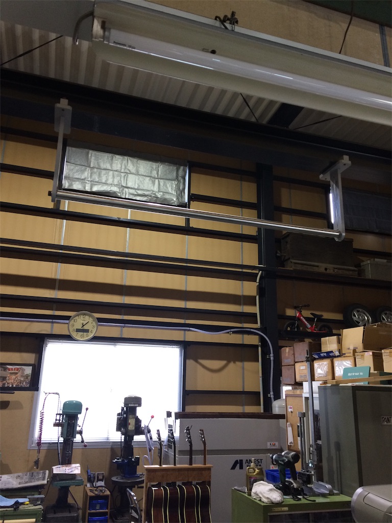 2020-11-07 懸垂棒 仕事場に懸垂棒があるの、 ご存知ですか?(^。^) 棒はステンレスの無垢なので、 しっかりしています(^^) もちろん鉄骨に止めるクランプも自作で、これも頑丈ですね(^。^) 両サイドにはピンストライプも描いています(^^) 2012年に作ったんですね(^。^) って・・・ ほとんど使ってないし! (≧∇≦) 最近、ぶら下がり健康器として使っています(笑)