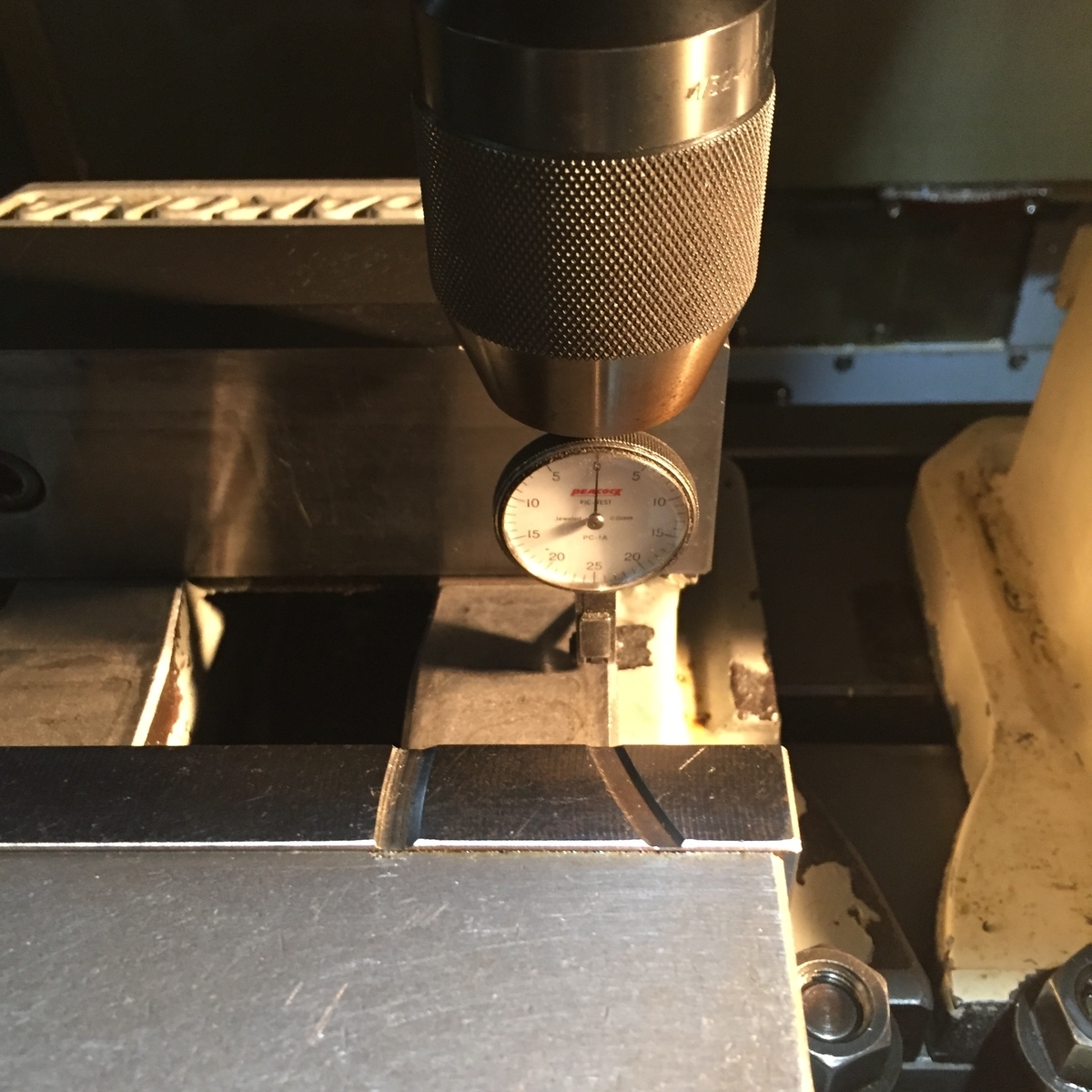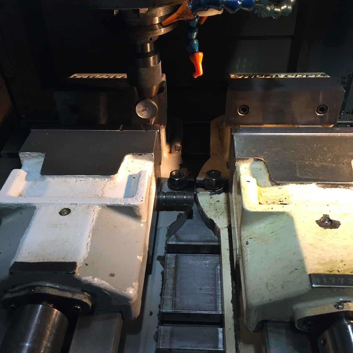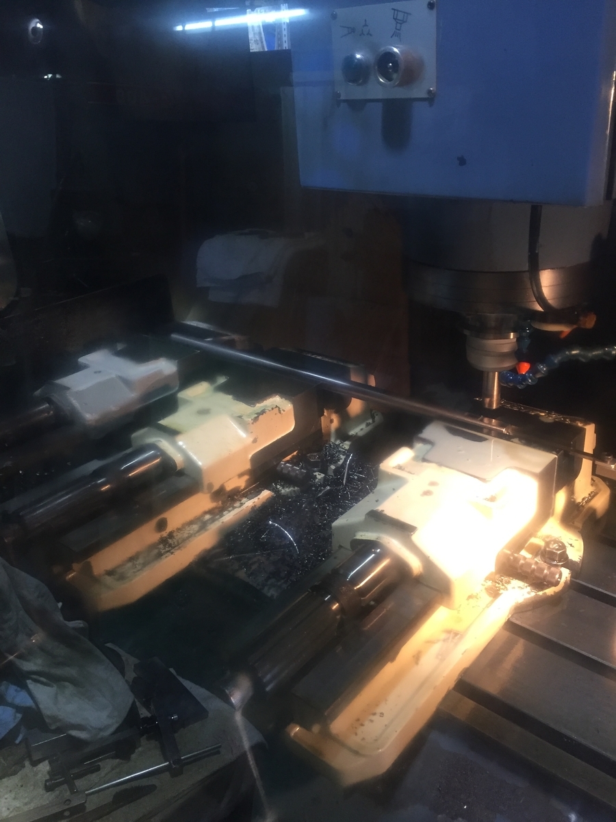 2022-07-26 段取り 今日は、もう1つバイスを載せる段取りをしてからスタートです(^。^)只今、手術中!(笑)左の空いてるスペースに載せるそこから平行を出してからボルトを締め込みます(^。^)めちゃくちゃシビアな加工じゃないので、0.01から0.02ミリぐらい違っていてもOK!です!(^-^)vそこから、今度は加工の段取りをして、やっとスタートです(^◇^;)ボチボチですが頑張りまーす!(^。^)